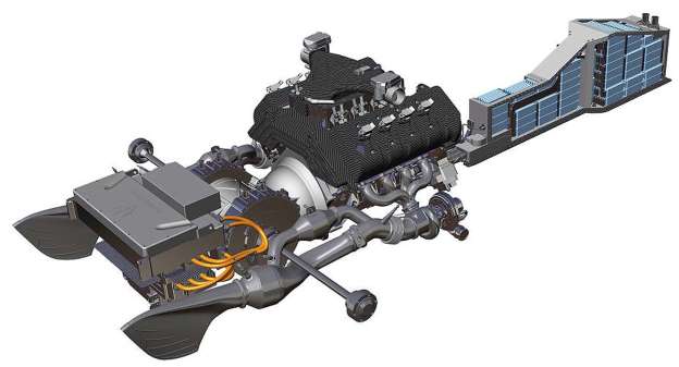 KDD直接傳動系統結合一具5.0升V8引擎,以及3組電動馬達,它取代了傳統的傳動系統,直接將引擎燃燒的動力傳送到後軸上,而不需要其他傳統變速機構,可減少50%的動力流失。 |