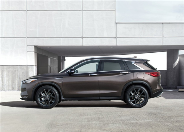 量產版 QX50 的外觀與先前各大登場的概念車十分相近,除了頭尾照明燈組沒有那般前衛之外,招牌的雙弓形水箱護罩、Powerful Elegance 設計語彙帶來肌理感線條皆如出一徹,展現出 Infiniti 新世代家族化面孔。另外全車多處像是水箱罩、弓形窗框以及雙邊單出矩形排氣管等部件,還用上鍍鉻飾條妝點出豪華質感,而 4,693x1,903x1679mm 的車身尺碼比前代車型略短,但寬度/高度略微增加則確保車室空間,軸距則為 2,800mm。