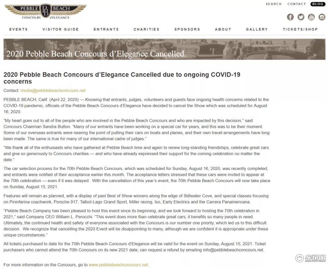 2020年本應該是第70屆圓石灘車展,主辦方宣佈只能推遲到2021815日,再來完成這一歷史時刻。已經入選的參展者將被邀請參加2021815日舉辦的圓石灘車展。本屆車展已售出的門票明年依然有效,如果已購票的消費者明年無法參加,則可以通過官方提供的電子郵件地址要求退款:info@pebblebeachconcours.net組織者還宣佈,今年的選車過程最近已完成,參賽者已於本月初得到受邀通知。對於入選今年圓石灘車展的邀請通知,2021年仍然有效。