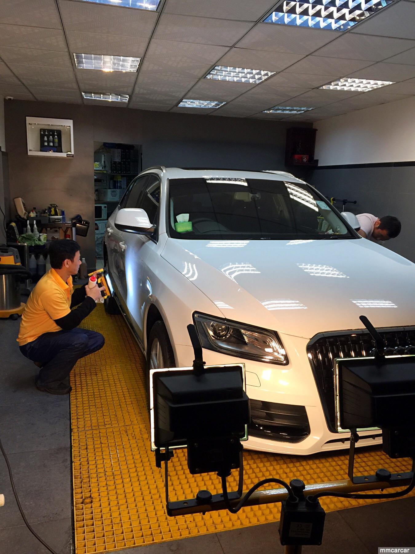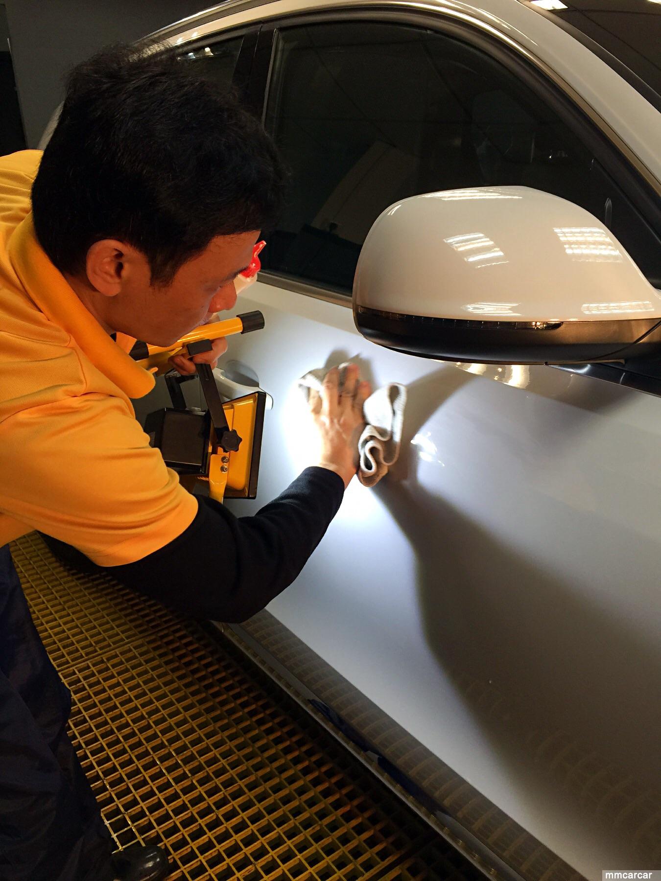 現在圖中進行車漆探燈工序,利用專業LED白光燈照射漆面然後找到發絲幼紋再用人手針對性研磨處理,呢個做法就是防止新車被拋光機進行拋光時導致力架層攤薄及拋花力架層,探燈工序只適合新車或較新之汽車做工序全人手所以極花時間及心機去做,所以本公司只能一天只做一台車的道理。